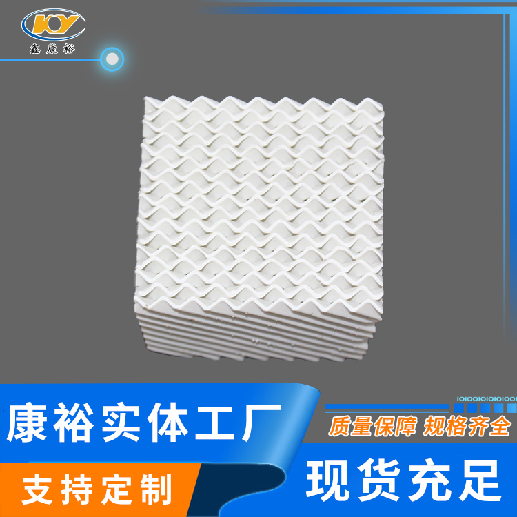 陶瓷波紋填料是一種新型規(guī)整填料,它是由許多具有相同幾何形狀的填料單元體組成。由于陶瓷的結(jié)構(gòu),具有良好的親水性能,其表面可形成極薄的液膜的湍動(dòng)及氣流的傾斜曲折通道能氣流但又不阻擋氣流使陶瓷填料能與金屬填料相匹敵,而其耐腐蝕、耐高溫性能金屬填料卻無(wú)法相比。表面結(jié)構(gòu)有良好的濕潤(rùn)性能,能使液體加快流動(dòng)、使填料滯液量降至低。從而降低了過(guò)熱、聚合和結(jié)焦的機(jī)會(huì)。