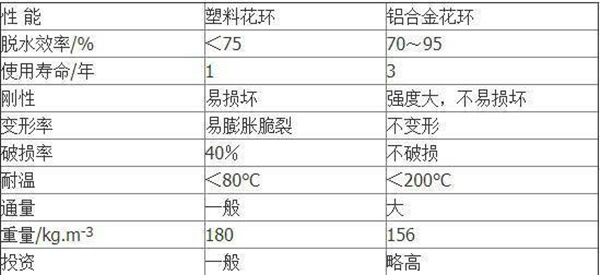 鋁花環(huán)填料主要應(yīng)用于TRT發(fā)電機組中噴堿塔以及鋼鐵廠高爐煤氣清洗中的脫水器,也可用于化工廠中的填料塔中。在煤氣脫水器中使用后煤氣中的機械水脫除到7g/Nm3。在鋼鐵廠二文填料脫水器中,與所用塑料花環(huán)相比,金屬花環(huán)填料增加,不易膨脹脆裂。鋁合金金屬花環(huán)填料作為材質(zhì)填料,在脫水性能、使用壽命等方面都比塑料花環(huán)明顯優(yōu)越(性能對比見表)。